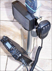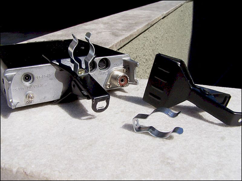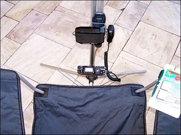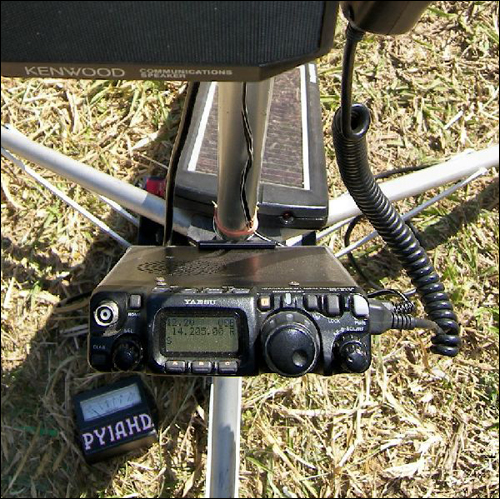O FT817 também e fixado com uma garra travada com um elástico grosso na parte inferior do suporte de banner . A garra é aparafusada a um pregador muito forte forrado de borracha que “morde” a parte de traz do FT817 e o mantém com o painel do rádio entre os joelhos do operador confortavelmente sentado em cadeira de camping dobrável .