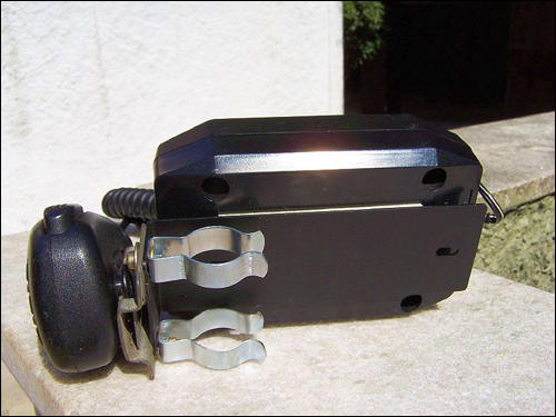 Num mesmo módulo coloquei um alto falante para estações móveis da Kenwood, um suporte de microfone e um relógio digital com termômetro.