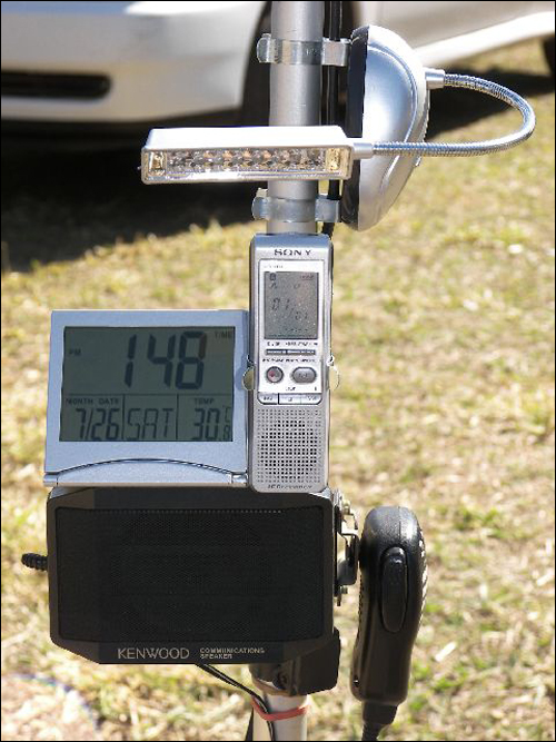 Numa outra garra coloquei um gravador digital da Sony para registro de áudio, e num par de garras acima de todos os módulos coloquei uma lanterna de alta intensidade que inunda de luz toda a área quando anoitece.